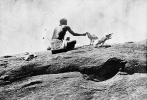 In Ancient Egypt, several hieroglyphs include the Egyptian vulture including what is listed as G1 in the Gardiner's sign list - U+1313F 𓄿 .[96] The bird was held sacred to Isis and Mut in ancient Egyptian religion. The use of the vulture as a symbol of royalty in Egyptian culture and their protection by Pharaonic law made the species common on the streets of Egypt and gave rise to the name "pharaoh's chicken".[97][98][99][100] The habit of coprophagy in Egyptian vultures gives them the Spanish names of "churretero" and "moñiguero", which mean "dung-eater".[50] In the Balkans, it is considered as a herald of spring and as a bird of good omen.[101] British sportsmen in colonial India considered them to be among the ugliest birds, and their habit of feeding on faeces was particularly despised.[102] In British India they were known as "shawks" a contraction[103] of shit-hawk.[104] In Sindh, it is believed that the yolk of the egg of the vulture can remove venom and cure snake bite and scorpion stings.[105] A southern Indian temple at Thirukalukundram near Chengalpattu was famed for a pair of birds that reputedly visited the temple for "centuries". These birds were ceremonially fed by the temple priests and arrived before noon to feed on offerings made from rice, wheat, ghee, and sugar. Although normally punctual, the failure of the birds to turn up was attributed to the presence of "sinners" among the onlookers.[28][106][107] Legend has it the vultures (or "eagles") represented eight sages who were punished by Shiva, with two of them leaving in each of a series of epochs.[108][109][110]