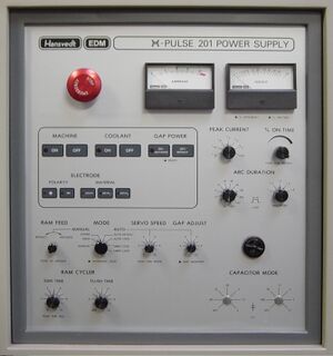 EDM control panel (Hansvedt machine). Machine may be adjusted for a refined surface (electropolish) at end of process.