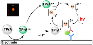 It generally uses Ruthenium complexes, especially [Ru(bpy)3]2+ (bpy = 2,2'-bipyridine) which releases a photon at ~620 nm regenerating with TPrA (Tripropylamine) in liquid phase or liquid–solid interface. It can be used as monolayer immobilized on an electrode surface (made e.g. of nafion, or special thin films made by Langmuir–Blogett technique or self-assembly technique) or as a coreactant or more commonly as a tag and used in HPLC, Ru tagged antibody based immunoassays, Ru Tagged DNA probes for PCR etc., NADH or H2O2 generation based biosensors, oxalate and organic amine detection and many other applications and can be detected from picomolar sensitivity to dynamic range of more than six orders of magnitude. Photon detection is done with photomultiplier tubes (PMT) or silicon photodiode or gold coated fiber-optic sensors. The importance of ECL techniques detection for bio-related applications has been well established.[9] ECL is heavily used commercially for many clinical lab applications.[10][11][12]