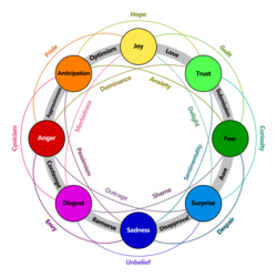 Robert Plutchik offers a three-dimensional model that is a hybrid of both basic-complex categories and dimensional theories. It arranges emotions in concentric circles where inner circles are more basic and outer circles more complex. Notably, outer circles are also formed by blending the inner circle emotions. Plutchik's model, as Russell's, emanates from a circumplex representation, where emotional words were plotted based on similarity.[16] There are numerous emotions, which appear in several intensities and can be combined in various ways to form emotional "dyads".[17][18][19][20][21]