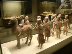 After a series of defeats by Wei Qing (the half-brother of Emperor Wu's favourite concubine) and Wei's nephew, Huo Qubing between 127 and 119 BC, the Xiongnu were expelled from the Ordos Desert and Qilian Mountains.[14] As a result of these territorial acquisitions, the Han dynasty successfully opened up the Northern Silk Road, allowing direct access to trade with Central Asia. This also provided a new supply of high-quality horse breeds from Central Asia, including the famed Ferghana horse (ancestors of the modern Akhal-Teke), further strengthening the Han army. Emperor Wu then reinforced this strategic asset by establishing five commanderies and constructing a length of fortified wall along the border of the Hexi Corridor, colonizing the area with 700,000 Chinese soldier-settlers.[15]