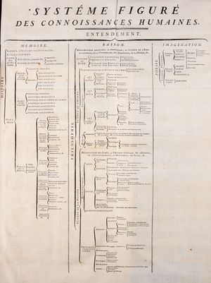 Like most encyclopedias, the Encyclopédie attempted to collect and summarize human knowledge in a variety of fields and topics, ranging from philosophy to theology to science and the arts. The Encyclopédie was controversial for reorganizing knowledge based on human reason instead of by nature or theology.[28] Knowledge and intellect branched from the three categories of human thought, whereas all other perceived aspects of knowledge, including theology, were simply branches or components of these man made categories.[29] The introduction to the Encyclopédie, D'Alembert's "Preliminary Discourse", is considered an important exposition of Enlightenment ideals. Among other things, it presents a taxonomy of human knowledge (see Fig. 3), which was inspired by Francis Bacon's The Advancement of Learning. The three main branches of knowledge are: "Memory"/History, "Reason"/Philosophy, and "Imagination"/Poetry. This tree of knowledge was created to help readers evaluate the usefulness of the content within the Encyclopédie, and to organize its content.[30] Notable is the fact that theology is ordered under "Philosophy" and that "Knowledge of God" is only a few nodes away from "Divination" and "Black Magic".
