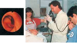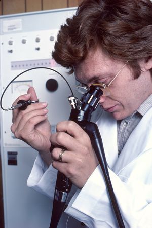أطباء يستخدمون منظار المعدة لفحص الجهاز الهضمي لأحد المرضى، وهذا النوع من المناظير الداخلية يمكن إدخاله إلى المعدة عن طريق الفم. والصورة (إلى اليسار) تبيّن تقرُّحًا في المعدة تم رصده من خلال منظار المعدة.