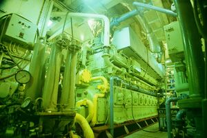 The engine room of a motor vessel typically contains several engines for different purposes. Main, or propulsion, engines are used to turn the ship's propeller and move the ship through the water. They typically burn diesel oil or heavy fuel oil, and may be able to switch between the two. There are many propulsion arrangements for motor vessels, some including multiple engines, propellers, and gearboxes.[بحاجة لمصدر]