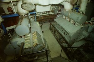 Engine room of the Mercy Ship Caribbean Mercy in 1997. Her propulsion diesel is an MAK.