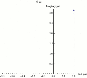 The exponential functionez can be defined as the limit of (1 + z/N)N, as N approaches infinity, and thus eiπ is the limit of (1 +iπ/N)N. In this animation N takes various increasing values from 1 to 100. The computation of (1 + iπ/N)N is displayed as the combined effect of N repeated multiplications in the complex plane, with the final point being the actual value of (1 +iπ/N)N. It can be seen that as N gets larger (1 +iπ/N)N approaches a limit of −1.