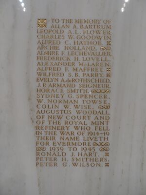 War memorial at Rothschild New Court, naming de Rothschild and those who worked at New Court and the Royal Mint Refinery.