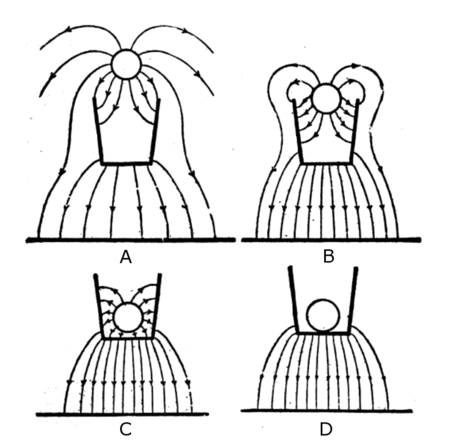 However this is not necessary. The experiment works very well even for containers with large uncovered openings, like Faraday's pail. As long as it is deep enough, and the depth of C inside the container is greater than the diameter of the opening,[12] the induced charge will be very close in value to the charge on C. As the drawing above shows, once the charged object is well inside, most of the electric field lines originating on the charge C end on the container walls, so very few of them pass through the opening to end on negative charges that are not located on the container. John Ambrose Fleming, a prominent early electrical researcher, wrote in 1911:[3]