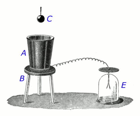 "Let A in the diagram represent an insulated pewter ice-pail...connected by a wire to a delicate gold-leaf electrometer E, and let C be a round brass ball insulated by a dry thread of white silk, three or four feet in length, so as to remove the influence of the hand holding it from the ice-pail below. Let A be perfectly discharged, and then let C be charged at a distance by a [electrostatic] machine or Leyden jar, and introduced into A.. If C be positive, E will also diverge positively; if C be taken away, E will collapse perfectly... As C enters the vessel A the divergence of E will increase until C is ... below the edge of the vessel, and will remain quite steady and unchanged for any greater depression. This shows that at that distance the inductive action of C is entirely exerted upon the interior of A, ... If C is made to touch the bottom of A, all of its charge is communicated to A, ... and C, upon being withdrawn, ... is found to be perfectly discharged."