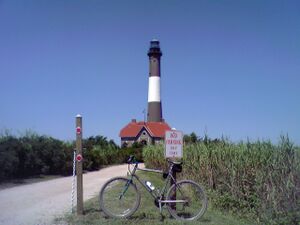The Fire Island Inlet grew to 9 ميل (14 km) in width before receding. The Fire Island Lighthouse was built in 1858, right on the inlet, but Fire Island's western terminus at Democrat Point has steadily moved west so that the lighthouse today is 6 ميل (10 km) from the inlet.