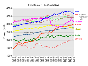 Other area (Yr 2010)[5] * أفريقيا، جنوب الصحراء - 2170 ك.س/للفرد/يومياً * شمال وشرق أفريقيا - 3120 ك.س/للفرد/يومياً * جنوب آسيا - 2450 ك.س/للفرد/يومياً * شرق آسيا - 3040 ك.س/للفرد/يومياً * أمريكا اللاتينية / الكارييبي - 2950 ك.س/للفرد/يومياً * البلدان المتقدمة - 3470 ك.س/للفرد/يومياً
