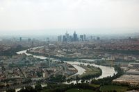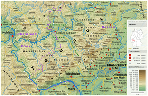 Frankfurt on the mouth of the Nidda into the Main, which flows into the Rhine between the Rhineland-Palatine capital of Mainz and the Hessian (historically Nassauian) capital of Wiesbaden. Also visible the Taunus suburbs of the districts of High Taunus and Main-Taunus, two of the wealthiest districts in Germany.