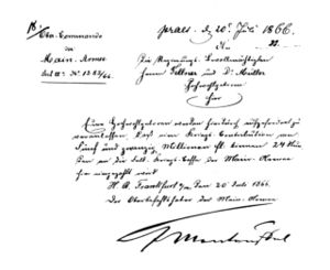 الحرب الپروسية النمساوية: المدينة الحرة فرانكفورت على الماين كان عليها أن تدفع 25 مليون فلورين إلى پروسيا كتعويض حرب في ظرف 24 ساعة (انذار نهائي في 20 يوليو 1866 بتوقيع الجنرال الپروسي إدڤن فون مانتويفل).