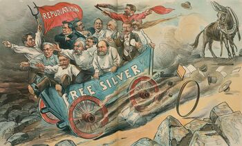 The Populist Party had a strong free-silver element. Its subsequent combination with the Democratic Party moved the latter from the support of the gold standard which had been the hallmark of the Cleveland administration to the free-silver position epitomized by 1896 presidential nominee William Jennings Bryan in his Cross of Gold speech.[8] Bryan's 1896 candidacy was supported by Populists and "silver Republicans" as well as by most Democrats.