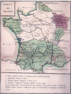 نظام الجمارك الفرنسية في 1732، مع لابورد (بما في ذلك بايون)، تبين نظاماً مالياً مستقلاً