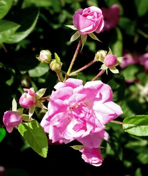 Although they arose too late to qualify technically as old garden roses, the hybrid musks are often informally classed with them, since their growth habits and care are much more like the old garden roses than modern roses. The hybrid musk group was mainly developed by Rev. Joseph Pemberton, a British rosarian, in the first decades of the 20th century, based upon 'Aglaia', an 1896 cross by Peter Lambert. A seedling of this rose, 'Trier', is considered to the foundation of the class.[14] The genetics of the class are somewhat obscure, as some of the parents are unknown. Rosa multiflora, however, is known to be one parent, and Rosa moschata (the musk rose) also figures in its heritage, though it is considered to be less important than the name would suggest. Hybrid musks are disease-resistant, repeat flowering and generally cluster-flowered, with a strong, characteristic "musk" scent.[34] The stems tend to be lax and arching, with limited thorns.[22] Examples include 'Buff Beauty' and 'Penelope'.