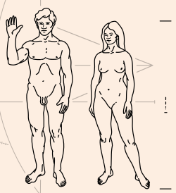 The male and female human genders, as depicted on part of the Pioneer plaques, attached to Pioneer spacecraft launched by the United States in the 1970s.