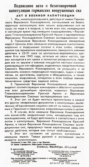 There were three language versions of the surrender document – English, Russian, and German – with the English and Russian versions proclaimed in the document itself as the only authoritative ones.