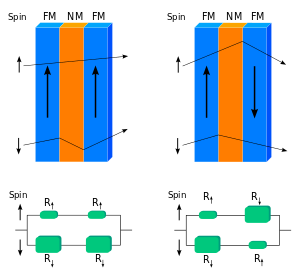 Such a device, with resistance depending on the orientation of electron spin, is called a spin valve. It is "open", if the magnetizations of its layers are parallel, and "closed" otherwise.[28]
