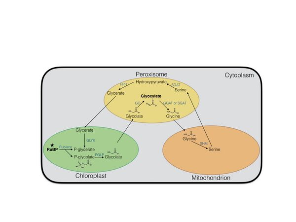In addition to being an intermediate in the glyoxylate cycle, glyoxylate is also an important intermediate in the photorespiration pathway. Photorespiration is a result of the side reaction of RuBisCO with O2 instead of CO2. While at first considered a waste of energy and resources, photorespiration has been shown to be an important method of regenerating carbon and CO2, removing toxic phosphoglycolate, and initiating defense mechanisms.[18][19] In photorespiration, glyoxylate is converted from glycolate through the activity of glycolate oxidase in the peroxisome. It is then converted into glycine through parallel actions by SGAT and GGAT, which is then transported into the mitochondria.[20][19] It has also been reported that the pyruvate dehydrogenase complex may play a role in glycolate and glyoxylate metabolism.[21]