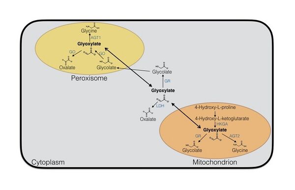 Glyoxylate is produced via two pathways: through the oxidation of glycolate in peroxisomes or through the catabolism of hydroxyproline in mitochondria.[16] In the peroxisomes, glyoxylate is converted into glycine by AGT1 or into oxalate by glycolate oxidase. In the mitochondria, glyoxylate is converted into glycine by AGT2 or into glycolate by glyoxylate reductase. A small amount of glyoxylate is converted into oxalate by cytoplasmic lactate dehydrogenase.[17]
