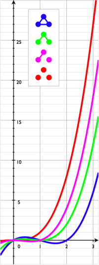 The chromatic polynomial is a function P(G, t) that counts the number of t-colorings of G. As the name indicates, for a given G the function is indeed a polynomial in t. For the example graph, P(G, t) = t(t − 1)2(t − 2), and indeed P(G, 4) = 72.