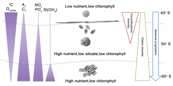The biogeography of Southern Ocean phytoplankton controls the local biogeochemistry and the export of macronutrients to lower latitudes and depth. Of particular relevance is the competitive interaction between coccolithophores and diatoms, with the former being prevalent along the Great Calcite Belt (40–60°S), while diatoms tend to dominate the regions south of 60°S, as illustrated in the diagram on the right.[33]