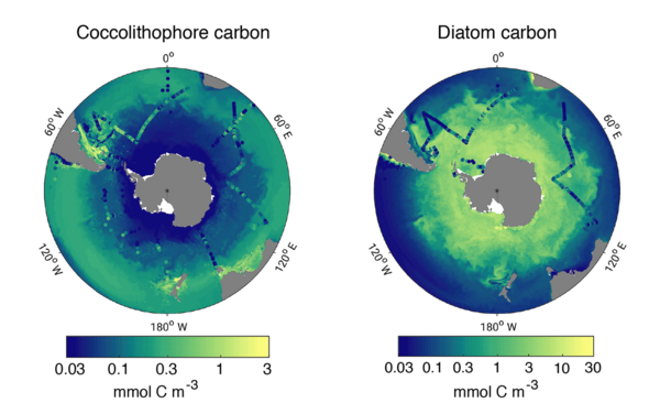 However, coccolithophores are the major phytoplanktonic calcifier.[49] thereby significantly impacting the global carbon cycle. Diatoms dominate the phytoplankton community in the Southern Ocean,[50][51][52] but coccolithophores have received increasing attention in recent years. Satellite imagery of particulate inorganic carbon (PIC, a proxy for coccolithophore abundance) revealed the "Great Calcite Belt",[53] an annually reoccurring circumpolar band of elevated PIC concentrations between 40 and 60°S. In situ observations confirmed coccolithophore abundances of up to 2.4×103 cells mL−1 in the Atlantic sector (blooms on the Patagonian Shelf), up to 3.8×102 cells mL−1 in the Indian sector,[16] and up to 5.4×102 cells mL−1 in the Pacific sector of the Southern Ocean [54] with Emiliania huxleyi being the dominant species.[16][55] However, the contribution of coccolithophores to total Southern Ocean phytoplankton biomass and NPP has not yet been assessed. Locally, elevated coccolithophore abundance in the GCB has been found to turn surface waters into a source of CO2 for the atmosphere,[16] emphasising the necessity to understand the controls on their abundance in the Southern Ocean in the context of the carbon cycle and climate change. While coccolithophores have been observed to have moved polewards in recent decades,[56][57][35] their response to the combined effects of future warming and ocean acidification is still subject to debate.[58][56][59][60][61] As their response will also crucially depend on future phytoplankton community composition and predator–prey interactions,[62] it is essential to assess the controls on their abundance in today's climate.[33]