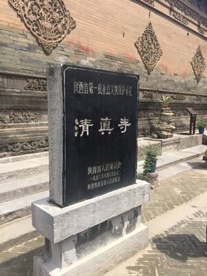 The mosque is a walled complex of four courtyards, with the prayer hall located in the fourth and also the westmost courtyard. The first and second courtyards are mostly traditional Chinese gardens, while the third and fourth courtyards are where the main structures of the mosques are located.[11][5] The courtyards are divided by walls and connected by gateways. Most of the architectural features present in the courtyards were constructed during or after the Ming dynasty.[3] However, there are artefacts dating from earlier than the Ming dynasty, such as the plaques on the gates of the second courtyard, which were plaque carvings dated from the Song dynasty (see image above). Each courtyard contains a central monument, such as a gate, and is lined with greenery as well as subsidiary buildings.