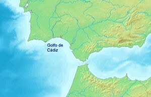 The Gulf of Cádiz is located in the north-eastern Atlantic Ocean between 34°N and 37°15′N and 6°W to 9°45′W.[1] It is enclosed by the southern Iberian and northern Moroccan margins, west of Strait of Gibraltar.[1]