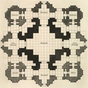 10. ^ These maps also noted the edges of the rectangular mosque-precinct to be lined up with the residences of Brahmin priests.
