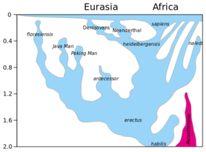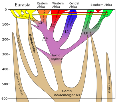 - ^ based on Schlebusch et al., "Southern African ancient genomes estimate modern human divergence to 350,000 to 260,000 years ago" Science, 28 Sep 2017, DOI: 10.1126/science.aao6266, Fig. 3 (H. sapiens divergence times) and Stringer, C. (2012). "What makes a modern human". Nature. 485 (7396): 33–35. Bibcode:2012Natur.485...33S. doi:10.1038/485033a. PMID 22552077. (archaic admixture).