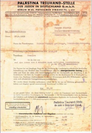 والمعروفة باسم اتفاقية هعڤراه، والتي ظلت سرية لخمسة عقود. كانت الاتفاقية تهدف إلى السماح لليهود في ألمانيا بالهجرة إلى فلسطين، بينما يقوم النازيون بتحويل الأموال. ما يقرب من 60% من الأموال الأجنبية التي تدفقت إلى فلسطين في الثلاثينيات جاءت من ألمانيا النازية.