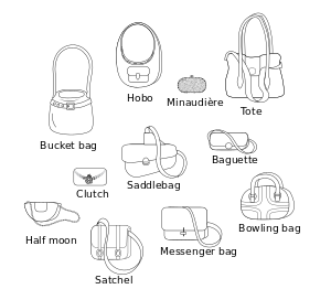 • Half-moon bag: shaped like a half-moon, usually smaller and feminine, worn hanging from the shoulder, may or may not have a handle[21]