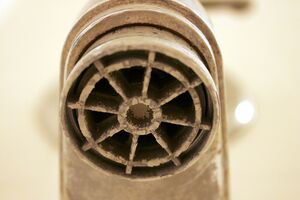 This precipitation (formation of an insoluble solid) is principally caused by thermal decomposition of bicarbonate ions but also happens in cases where the carbonate ion is at saturation concentration.[9] The resulting build-up of scale restricts the flow of water in pipes. In boilers, the deposits impair the flow of heat into water, reducing the heating efficiency and allowing the metal boiler components to overheat.