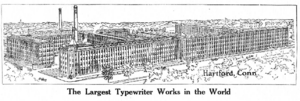 Around 1850, Hartford native Samuel Colt perfected the precision manufacturing process that enabled the mass production of thousands of his revolvers with interchangeable parts. A variety of industries adopted and adapted these techniques over the next several decades, and Hartford became the center of production for a wide array of products, including: Colt, Richard Gatling, and John Browning firearms; Weed sewing machines; Columbia bicycles; Pope automobiles; and leading typewriter manufacturers Royal Typewriter Company and Underwood Typewriter Company which together made Hartford the “Typewriter Capitol of the World” during the first half of the 20th century.[32]
