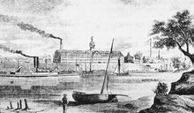 Just three years after Colt's first factory opened, the Sharps Rifle Manufacturing Company set up shop in 1852 at a nearby site along the now-buried Park River, located in the present-day neighborhood of Frog Hollow. Their factory heralded the beginning of the area's transformation from marshy farmland into a major industrial zone. The road leading from town to the factory was called Rifle Lane; the name was later changed to College Street and then Capitol Avenue.[33] A century earlier, mills had located along the Park River because of the water power, but by the 1850s water power was approaching obsolescence. Sharps located there specifically to take advantage of the railroad line that had been constructed alongside the river in 1838.