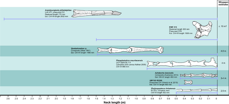 Neck length of Hatzegopteryx (second from top) compared to comparable azhdarchids; Arambourgiania (at top), Quetzalcoatlus sp. (third from top)