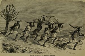The first Europeans to pass through Kagera Region were John H. Speke and James A. Grant during their 1860–1861 expedition in search for the source of the Nile. Their expedition, sponsored by the Royal Geographical Society, started in Zanzibar in October 1860 and took them across the mainland where they arrived in Karagwe in November 1861. It is said that upon their arrival in Karagwe, King Rumanyika I consulted his spiritual advisers and, after clearing Speke and Grant of any threat, waived the entry fee (hongo) typically required foreigners, going so far as to refer to Speke and Grant as his guests.[29][20] Speke's journal talks kindly of King Rumanyka's hospitality.[29] Speke left Karagwe for Buganda in January 1862 while Grant, forced to remain due to a swollen foot, did not depart until April. The next European to visit the region was Welsh journalist Henry Morton Stanley in 1874. Stanley's expedition, subsidized by the New York Herald and The Daily Telegraph, was to continue mapping the region's lakes and rivers initiated by Speke and Grant. During his travels through the Kingdom of Ihangiro, Stanley's party engaged in a small skirmish with King Ntare II over their passage through his territory.[30] Stanley's party, setting up camp on Bumbire Island, negotiated with King Ntare II and secured passage north through to Karagwe on their way to Buganda. Overall, European interests in Haya kingdoms during this period were of marginal interest compared to Karagwe and Buganda.[21]