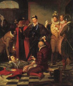 فلما اجتمع المندوبون لاحظ الملك في سخط مظاهر التكريم التي حظي بها جيز والتي تقرب مما يحظى به الملوك. وفي يوم تصميم مسعور أقنع بعض أعوانه بقتل الدوق. ودعا إلى لقاء خاص، وبينما النبيل الشاب يقترب من حجرة الملك طعنه تسعة من المهاجمين طعنات أودت بحياته، وفتح الملك الباب وتطلع في رضى يشوبه الانفعال إلى هدفه الذي تحقق (24 ديسمبر 1588). ثم أمر بسجن زعماء الحلف وقتل الكردينال جيز أخي الدوق. وفي فخر ورعب أنهى إلى أمه بطولاته التي ناب فيها عنه غيره، فعصرت يديها في يأس وقالت له »إنك خربت المملكة«.