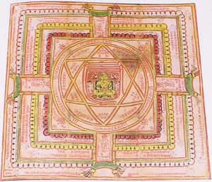 The hexagram is a mandala symbol called satkona yantra or sadkona yantra found on ancient South Indian Hindu temples. It symbolizes the nara-narayana, or perfect meditative state of balance achieved between Man and God, and if maintained, results in "moksha," or "nirvana" (release from the bounds of the earthly world and its material trappings).[بحاجة لمصدر]
