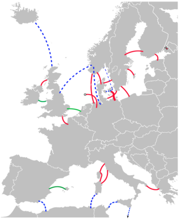 HVDC interconnections in western Europe - red are existing links, green are under construction, and blue are proposed. Many of these transfer power from renewable sources such as hydro and wind. For names, see also the annotated version.