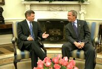 Five Nordic Prime Ministers (Matti Vanhanen (left) from Finland, Davíð Oddsson (second left) from Iceland, Kjell Magne Bondevik (center) from Norway, Anders Fogh Rasmussen (second right) from Denmark, and Göran Persson (right) from Sweden) at the Nordic Council Session in Oslo, on 27 October 2003.