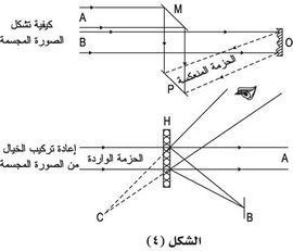وعندما تُظهَّر لوحة التصوير هذه تعطي ما يسمى الصورة المجسمة بكل تفاصيلها. وبإجراء عملية عكسية لعملية التصوير كما في الصورة أسفل الشكل رقم 4 فإن خيال الجسم المصور يمكن أن يعاد تركيبه من جديد. أي تضاء الصورة المساحية السالبة H بحزمة ليزرية وحيدة التواتر لها التواتر المرسل نفسه.