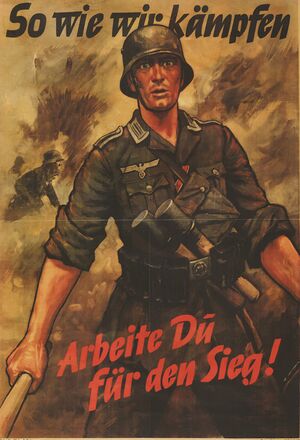 Advice about eating a healthier diet and home growing produce was distributed. Slogans like "Digging for Victory" and "Make Do and Mend" appeared on national posters and became a part of the war effort. The city environment made these efforts nearly negligible.[15] In the more remote country villages, however, clandestine slaughtering, vegetable gardens and the availability of milk products permitted survival. The official ration provided starvation-level diets of 1,300 or fewer calories a day (5400 kJ), supplemented by home gardens and, especially, black market purchases.[16]