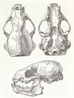 تتشابه الجمجمة قليلاً مع جمجمة الغرير الأوروبي ولكنها تتشابه بدرجة كبيرة مع النسخة الكبرى للظربان الرخامية،[15] تم بناء الجمجمة لتكون صلبة جداً حيث لا يوجد أي أثر لبناء عظمي مستقل في البالغين، يكون قحف المخ أوسع بدرجة كبيرة من قحف المخ في الكلاب.