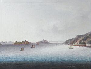 Because of its strategic location as the naval gateway to the city of Guangzhou (Canton), the strait was strongly fortified during the Qing dynasty. It was defended by eight forts: Shakok (Shajiao), Taikok (Dajiao), Wangtung (Hengdang), Yung-an (Yong'an), Kung-ku (Gonggu), Chen-yuan (Zhenyuan), Ching-yuan (Jingyuan), and Wei-yuan.[7] Between September 1809 and January 1810, Portuguese Navy ships based in Macau defeated a group of Chinese pirates in the Battle of the Tiger's Mouth.