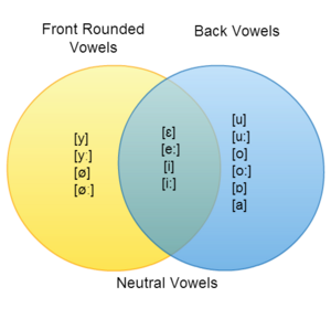 While /i/, /iː/, /ɛ/, and /eː/ are all front unrounded vowels, they are considered to be "neutral vowels" in Hungarian vowel harmony.[20] Therefore, if a word contains back vowels, neutral vowels may appear alongside them. However, if only neutral vowels appear in a stem, the stem is treated as though it is of front vowel assonance and all suffixes must contain front vowels.[19]