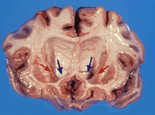 Medium spiny neurons (yellow) with nuclear inclusions, which occur as part of the disease process, stained orange | |
