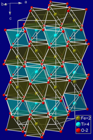 يتبلور الإلمنيت في نظام ثلاثي الأضلاع. البنية البلورية للإلمنيت consists of an ordered derivative of the corundum structure; in corundum all cations are identical but in ilmenite Fe2+ and Ti4+ ions occupy alternating layers perpendicular to the trigonal c axis. Containing high spin ferrous centers, ilmenite is paramagnetic.